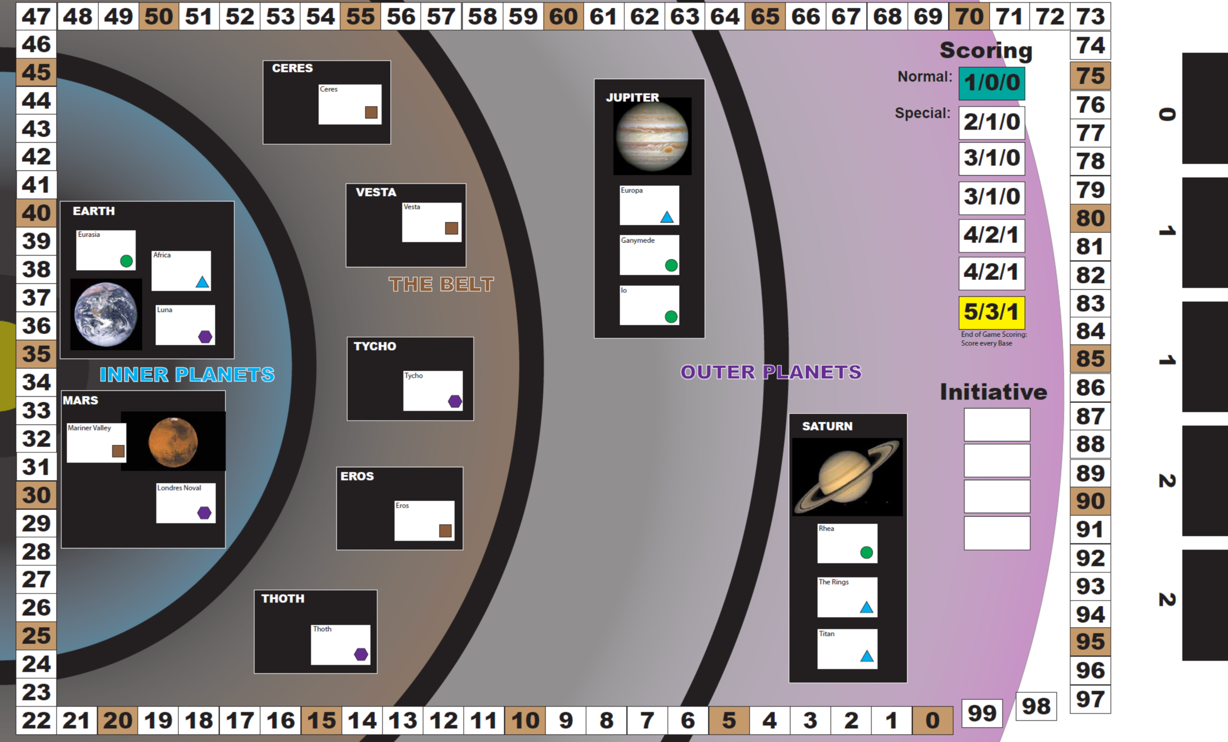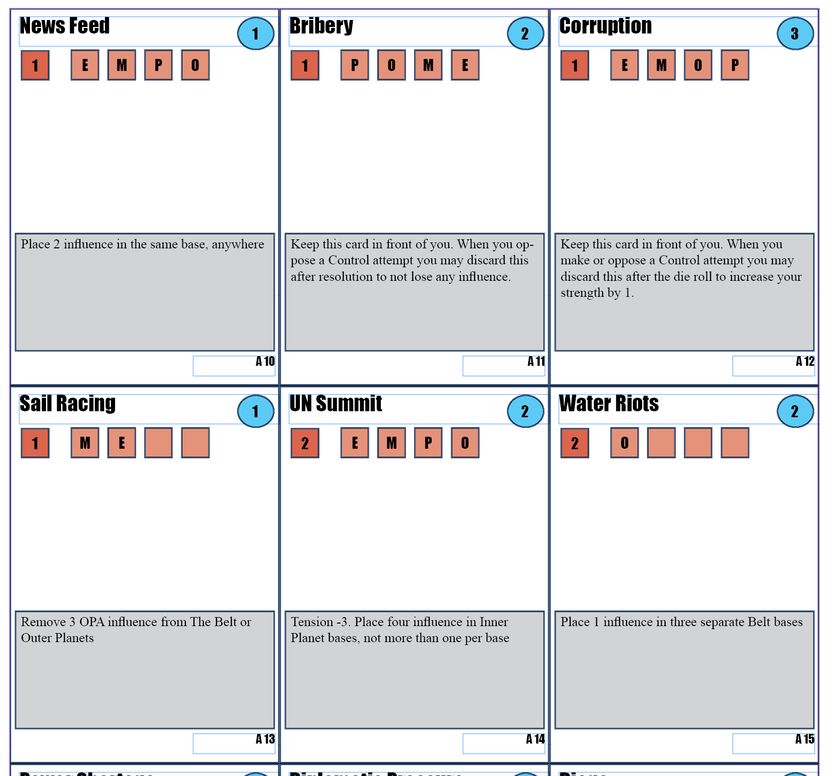 The biggest design challenge was making the Action/Event system work for multiple players. If the active player couldn’t or didn’t want to do the event on the card, who would get to do it? In the end, simplicity won out, with a basic priority system that added interesting choices, layered on top of a “card queue” system. The economic system got absorbed into the Victory Point system. Rather than adding a new resource into the game, players can spend VPs to do special things, and controlling bases that match the type of resource they need (like Food for the OPA), gives bonus VPs, which gives more spending flexibility.